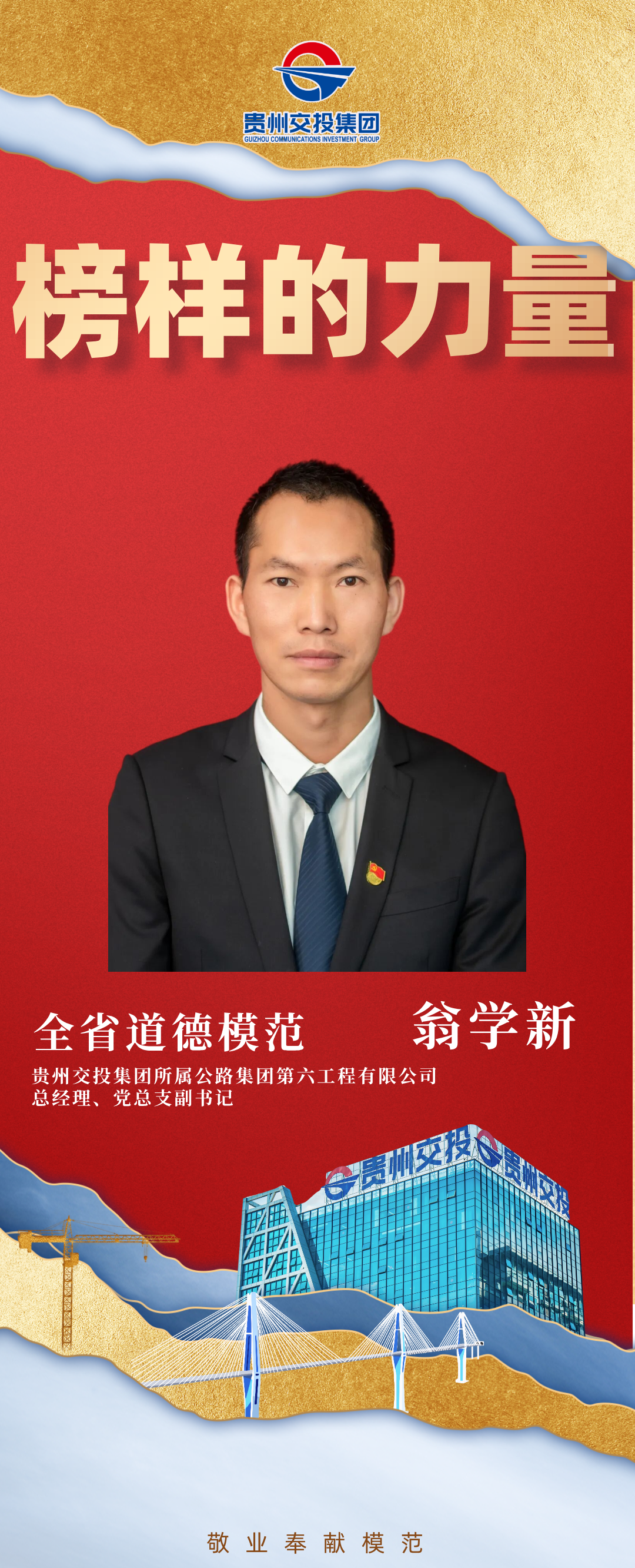 翁学新,贵州交投集团所属公路集团第六工程有限公司总经理、党总支副书记。2003年7月参加工作,先后参建广西百罗高速、湖北沪蓉西高速和贵州施青1标、仁赤25标、白黔6标、兴义环高1-3标、纳晴15标等项目。在白黔高速耳海河大桥、兴义环高峰林大桥、纳晴高速牂牁江大桥、黔西南州金州大桥等重点工程建设中,他作为项目负责人,大胆创新、奋勇争先,用实干托起贵州桥梁建设的新“高度”,为推动贵州交通事业发展积极贡献力量,先后被授予贵州省建筑业企业“优秀项目经理”、贵州省“五一劳动奖章”、贵州省首届“最美劳动者”“贵州交通科技英才”、贵州省劳动模范等称号。