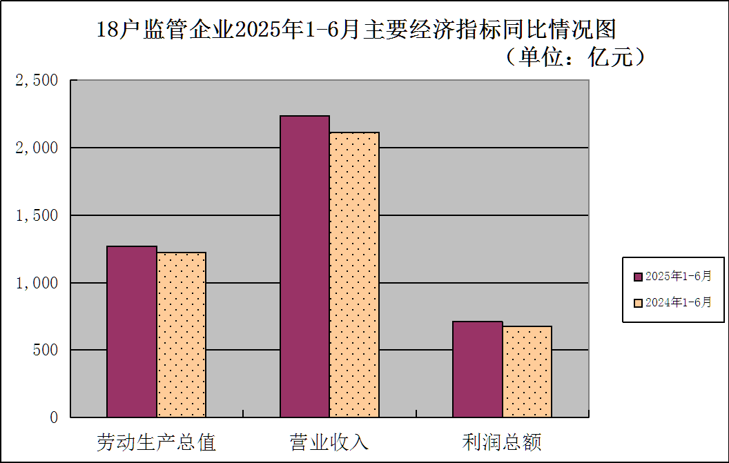 1-6月,18户独资及控股企业实现营业收入2,237.3亿元、同比增长5.9%;实现利润总额711.1亿元、同比增长5.2%;实现劳动生产总值1,270.9亿元、同比增长4.1%;应交税费总额499.9亿元、同比增长0.5%。截至6月末,18户独资及控股企业资产总额15,637.3亿元,同比增长7.3%;负债总额7,922.5亿元、同比增长5.5%;所有者权益7,714.8亿元、同比增长9.1%。