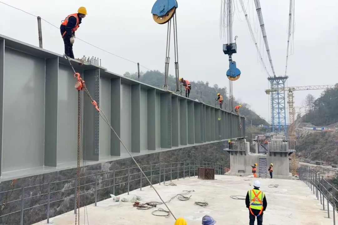 该桥跨越乌江深切峡谷,面临地形陡峭险峻、作业空间受限等挑战,项目团队以技术创新破局,经多轮方案优化,创新采用“隧道内二次组拼+缆索吊提吊安装”工艺。此次吊装的钢梁重达81吨、全长47米,经标准化工厂制作、精准洞内二次组拼、平稳转运出洞后,由120吨缆索吊系统精准完成起吊、牵引、落位及对接。