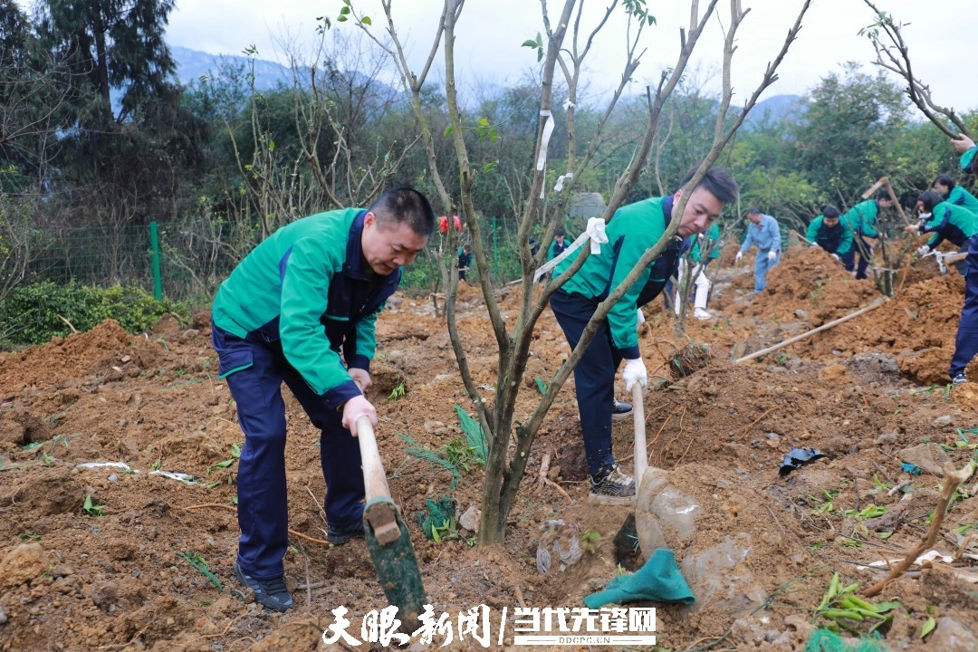 人群中,一位两鬓微霜的老师傅正半蹲着,将一株真龙柚树苗轻轻放入土坑,双手轻轻拍打培实根部的土壤。
